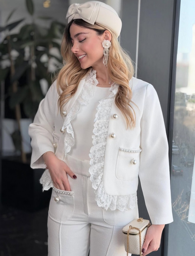 لبه کت گیپور دوزی شده با دکمه های مرواریدی که زیبایی این ست چندین برابر کرده ست